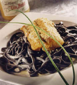 Kabeljauwhaasjes kruiden, inwrijven met Extra mosterd Ferdinand Tierenteyn en bedekken met paneermeel. Gaarmaken in de oven met witte wijn, water en fijn gesneden sjalotten. Wanneer de vis bijna gaar is even gratineren onder de grill, vis verwijderen en warm houden. Het resterende vocht laten inkoken en afwerken met boter en mosterd. De zwarte tagliatelle koken al dente in licht gezouten water.